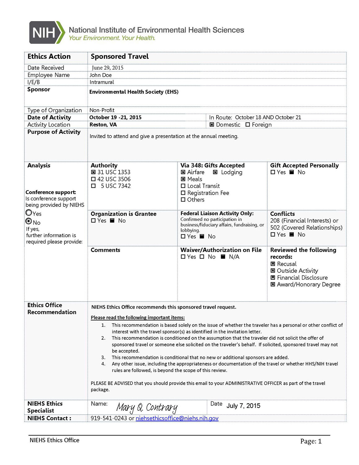 As sponsored travel invitations are received in the NIEHS Ethics Office, a conflict analysis of each employee's ethics file is conducted to ensure no personal conflict of interest (COI) is present between the employee and the sponsoring organization. The conflict analysis consists of reviewing applicable documents that the employee may have on file such as: financial disclosure reports, awards, outside activities, official duty documents, etc. After reviewing the applicable documents, a COI Ethics Office Recommendation memo is prepared and emailed to the traveler and their Administrative Officer. A copy of the COI memo and sponsored invitation is kept in the NIEHS Ethics Office. Click on the image below to see what the recommendation memo contains.