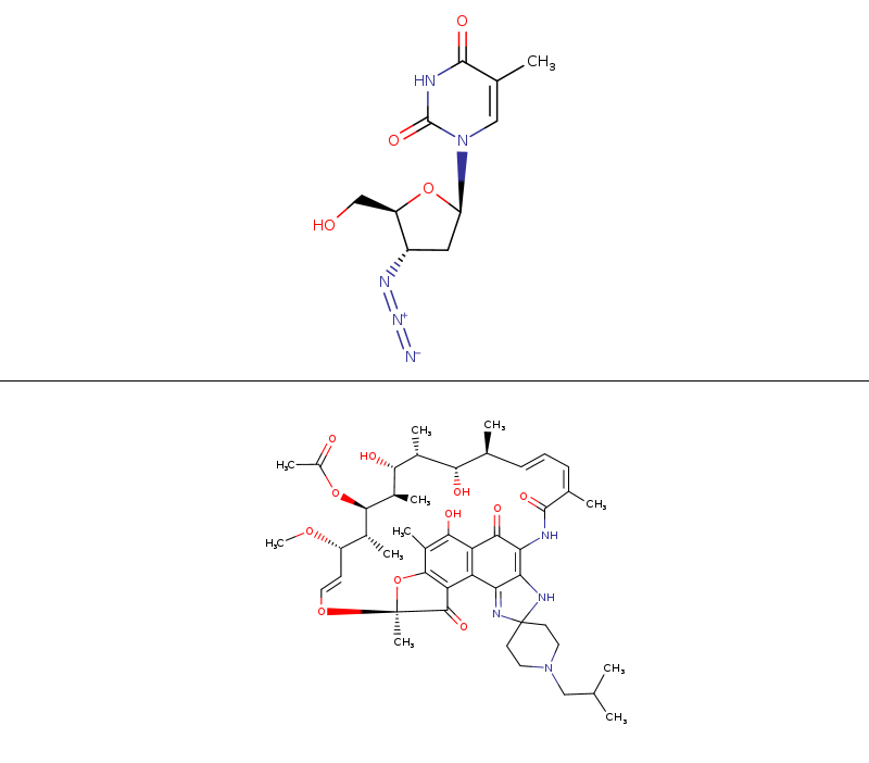 Administration of AZT in combination with rifabutin resulted in severe hematotoxicity in male and female-A mice, and the severity of the anemia was far greater than that induced by AZT alone. The anemia caused significant mortality in female-A mice treated for approximately 30 days. The anemia in males was accompanied microscopically by cellular depletion of bone marrow and atrophy of the red pulp of the spleen. Thrombocytosis also occurred in male and female-A mice. A leukopenia with a corresponding decrease in neutrophil counts was evident in both males and in female-A groups in which mortality occurred. Combination therapy also exacerbated the hepatotoxicity induced by rifabutin alone. Mixed cell in filtration and cytoplasmic alteration in the liver of male and female-A mice were accompanied by centrilobular atrophy, which may have been secondary to the severe anemia. Increased ALT activities and elevated bile acid concentrations and liver weights accompanied the microscopic manifestations of liver toxicity. AZT at 400 mg/kg and rifabutin at 640 mg/kg when administered in combination appear to have increased the plasma levels of both compounds as compared to administration of either compound alone.