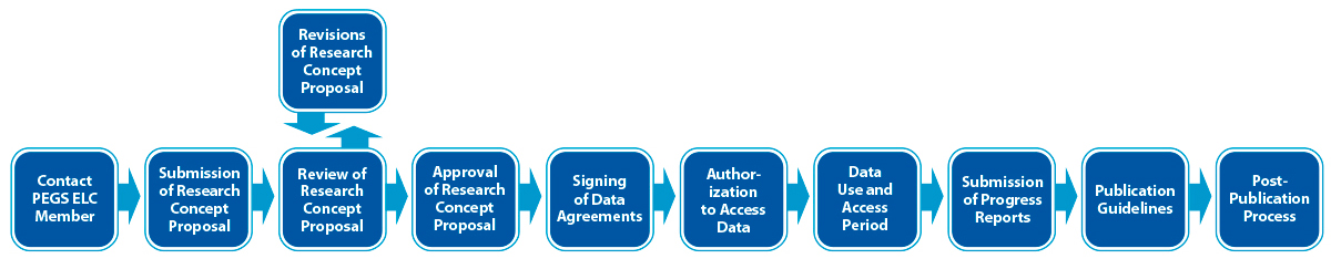 The first step for researchers interested in initiating a collaborative investigation with PEGS is to contact a member of the PEGS ELC and provide a brief description of the proposed project. The PEGS ELC member forwards this initial request to the PEGS ELC to ascertain whether it represents a novel area of research that differs sufficiently from already approved studies. At least one PEGS investigator must serve as a co-investigator for all collaborative research, and the ELC members determine the appropriate PEGS investigator involvement at the time. - Submission of Research Concept Proposal