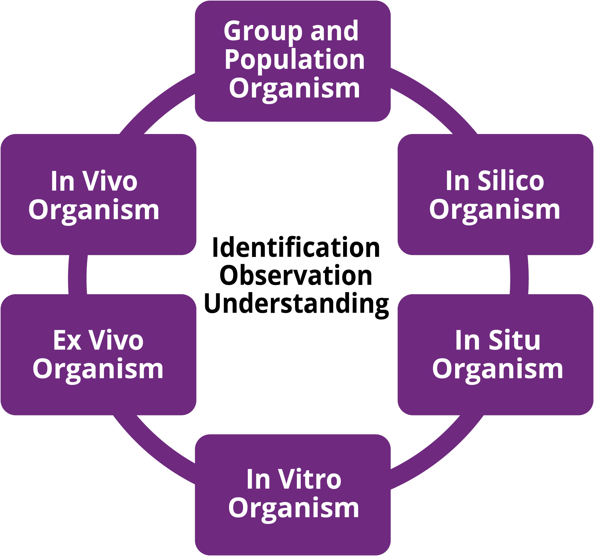 Our framework recognizes that fundamental research “addresses all levels of biological organization – molecular, biochemical pathway, cellular, tissue, organ, model organism, human, and population”. We place those categories at the center of the model and connect these questions with an associated experimental setting (in vivo, in vitro, in situ, in silico, or in a population at large), AND organism (human, animal, plant, bacteria, yeast, worm, fish, other model organisms, etc.). We suggest that these three elements are intrinsically linked, and moving from one category to another represents a clear translational bridge.