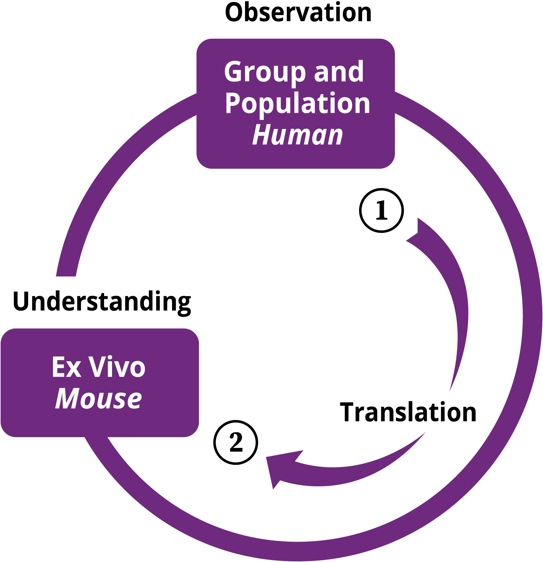 For example, if a translational research story starts with an observation from an epidemiological cohort study (observation/population/human) and then moves to a lab-based study designed to discover a mechanistic understanding of the effect of an environmental exposure using mouse tissue (understanding/ex vivo/mouse), then using our framework, the research would be recognized for crossing a translational bridge.