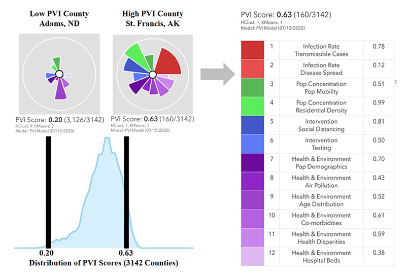 The PVI was developed to summarize and communicate complex, high-dimensional data related to communities’ vulnerability to COVID-19. The corresponding scorecards are human-centric and focus on impacts at the community level. Accordingly, data were apportioned into slices using a combination of quantitative modeling and prior knowledge of risk drivers.
