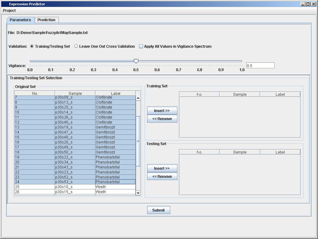 8. Click on the "Insert>>" button on the Testing Set Panel