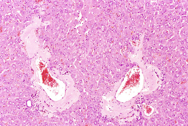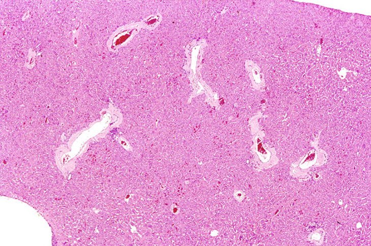 Amyloid deposition is rare in B6C3F1 mice but more common in the liver (and also the gallbladder) of CD-1 mice. It is usually located beneath the sinusoidal lining and in the wall of portal blood vessels. Amyloid deposition around blood vessels in the portal areas.