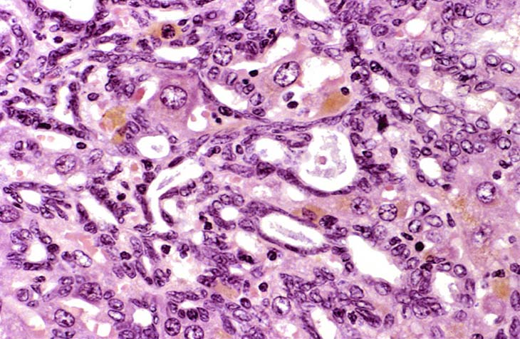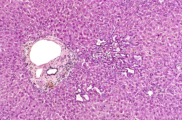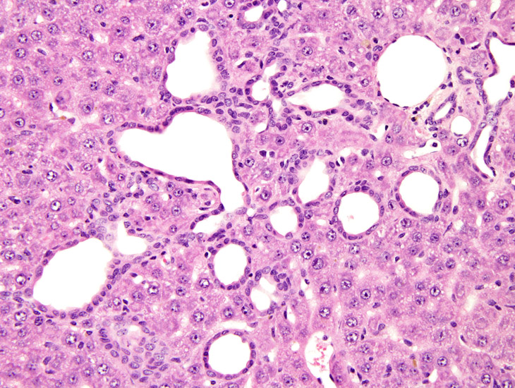Higher magnification showing low cuboidal to flattened biliary epithelium forming irregularly shaped bile ducts.