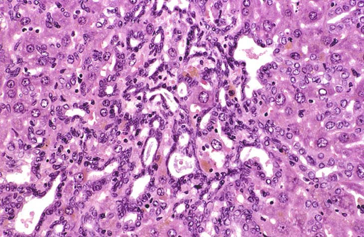 While most examples of bile duct hyperplasia consist of a modest duplication of normal appearing bile ducts in portal areas, occasionally more dramatic examples are found in other areas of the hepatic lobule.