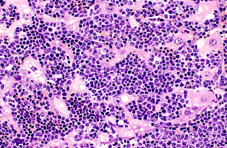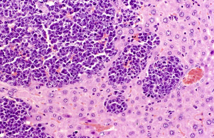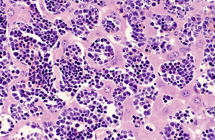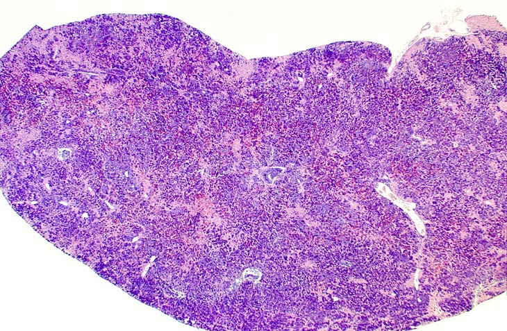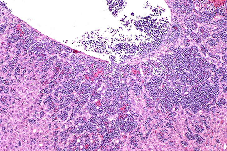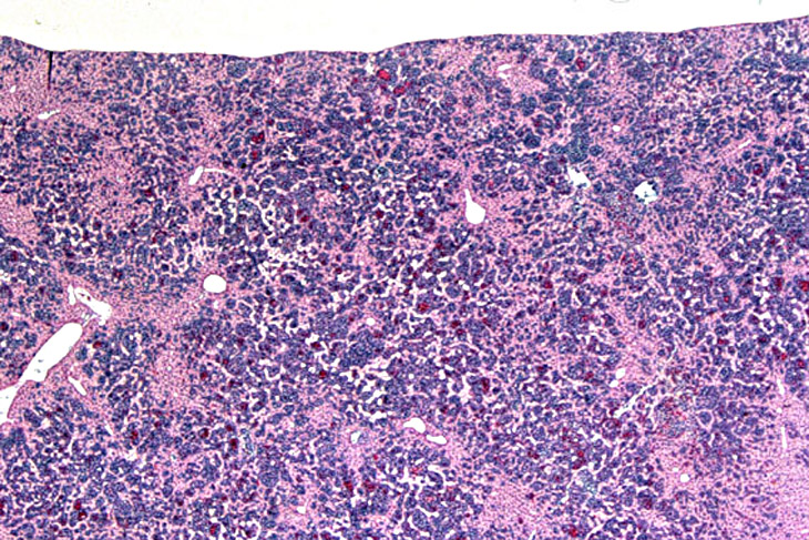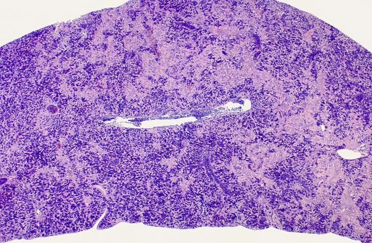 Visit the NTP WebsiteErythroleukemia is a spontaneous hematopoietic neoplasm of Tg.AC mice characterized by marked hepatomegaly. The affected liver is infiltrated by metarubricytes and less differentiated erythroid precursors.