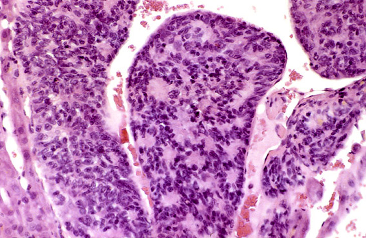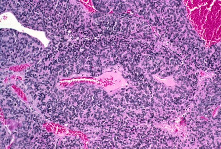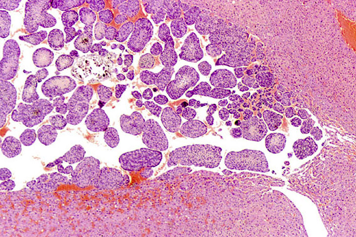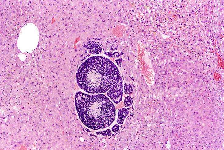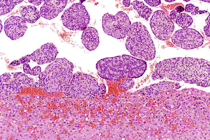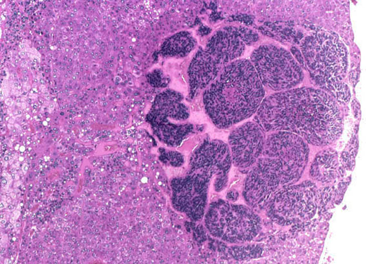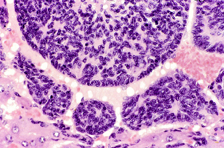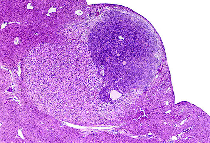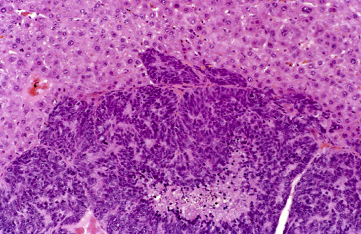 Visit the NTP WebsiteHepatoblastomas may be small or large lesions comprised of hyperchromatic cells with scant cytoplasm. Most appear to arise within hepatocellular carcinomas and occasionally within adenomas as well demarcated lesions. It is speculated that hepatoblastomas represent a poorly differentiated variant of hepatocellular carcinomas.