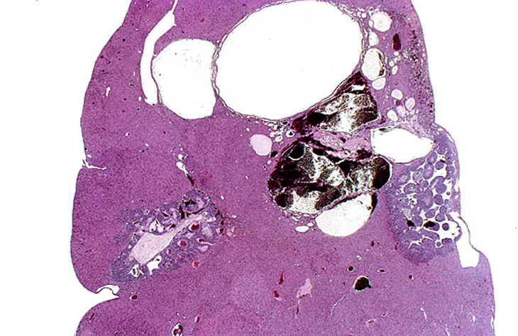 Hepatoblastomas and biliary cysts in the liver of an adult mouse.
