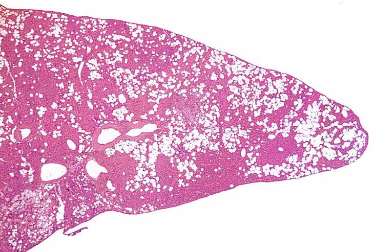 Visit the NTP WebsiteLipomatous lesions (Ito cell tumors) are occasionally observed in mouse liver. While they may often resemble lipomas, some portions of these lesions may have a myxomatous appearance. They have been diagnosed as Ito cell lesions (Ito cell hyperplasia and Ito cell neoplasia) as well as lipomas. One case in the NTP archives that is morphologically similar to an Ito cell neoplasm was diagnosed as a sinusoidal cell sarcoma. The exact origin of these lesions is unknown but an origin from the vitamin A storing Ito cell is one possibility. Since it is not possible to identify vitamin A storing cells in H&S-stained sections, it may be more prudent to refer to these cells simply as perisinusoidal lining cells. The distinction between hyperplasia and neoplasia is not clear and the biological behavior of these lesions is not known. Metastases have not been noted, suggesting that these are benign proliferative lesions. These lesions are sometimes associated with extensive atrophy and destruction of hepatic parenchyma.