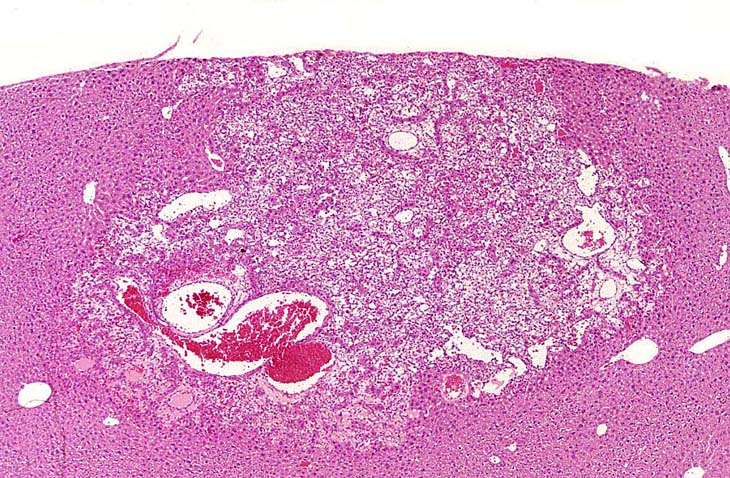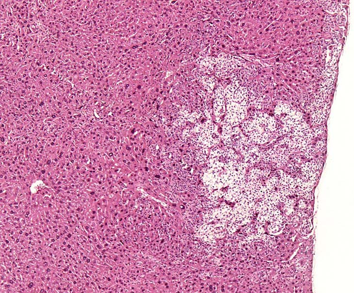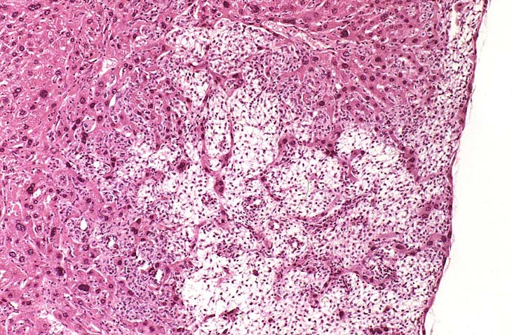 A relative discrete Ito cell tumor is present within this hepatic lobe; a higher magnification shows proliferation of stellate cells within the hepatic sinusoidal spaces.