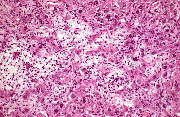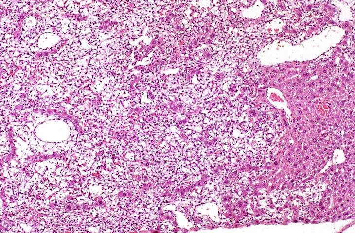 The proliferating stellate cells have a myxomatous appearance in some areas and have caused atrophy of hepatic cords.