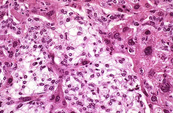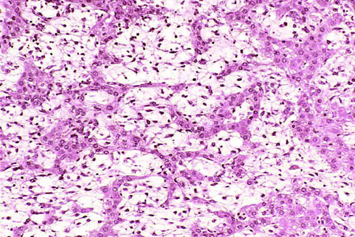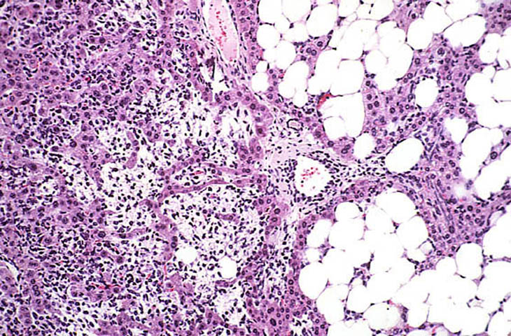An Ito cell tumor that has replaced much of the normal hepatic parenchyma without distorting the normal contour of the liver; higher magnification shows fat-filled and stellate cells in the hepatic sinusoids.