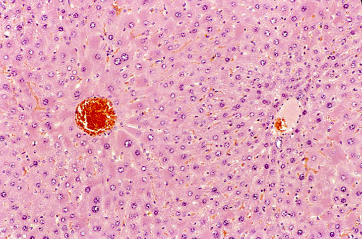 Minimal centrilobular hepatocyte hypertrophy is present and most dramatically involves enlargement of hepatocytes immediately adjacent to the central vein. The periportal hepatocytes (right side of image) are not affected.