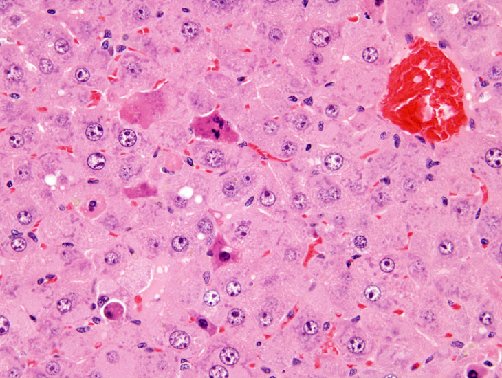 Early development of apoptosis. Affected hepatocytes are hypereosinophilic and angular with fragmented and condensed nuclear material within the cytoplasm.