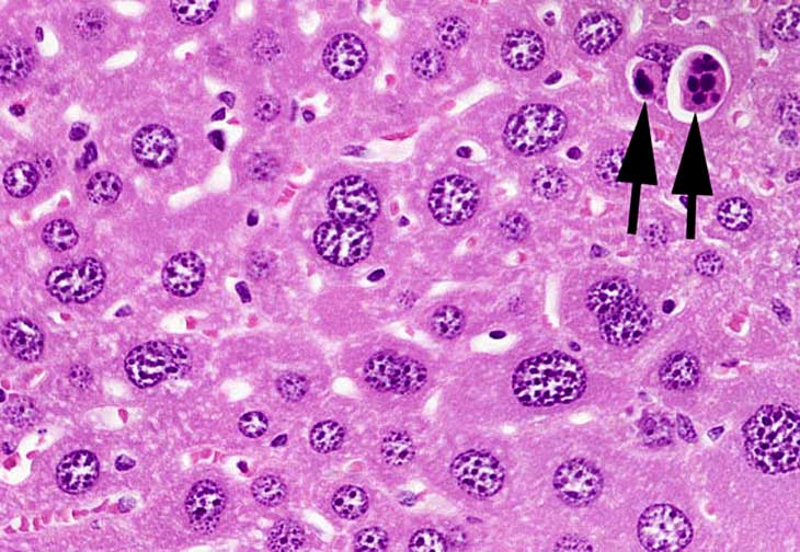 Hepatocytomegaly and karyomegaly with apoptotic bodies (arrows).