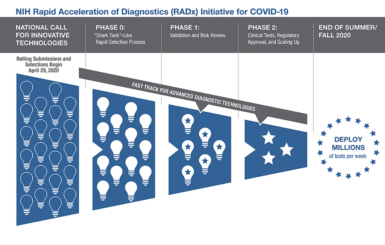 - NOT-OD-20-121 — “Encourages community-engaged testing research projects [to] supplement large-scale networks, consortia, or centers, [and] will examine SARS-CoV-2 infection patterns and efforts to increase access and effectiveness of diagnostic methods.”