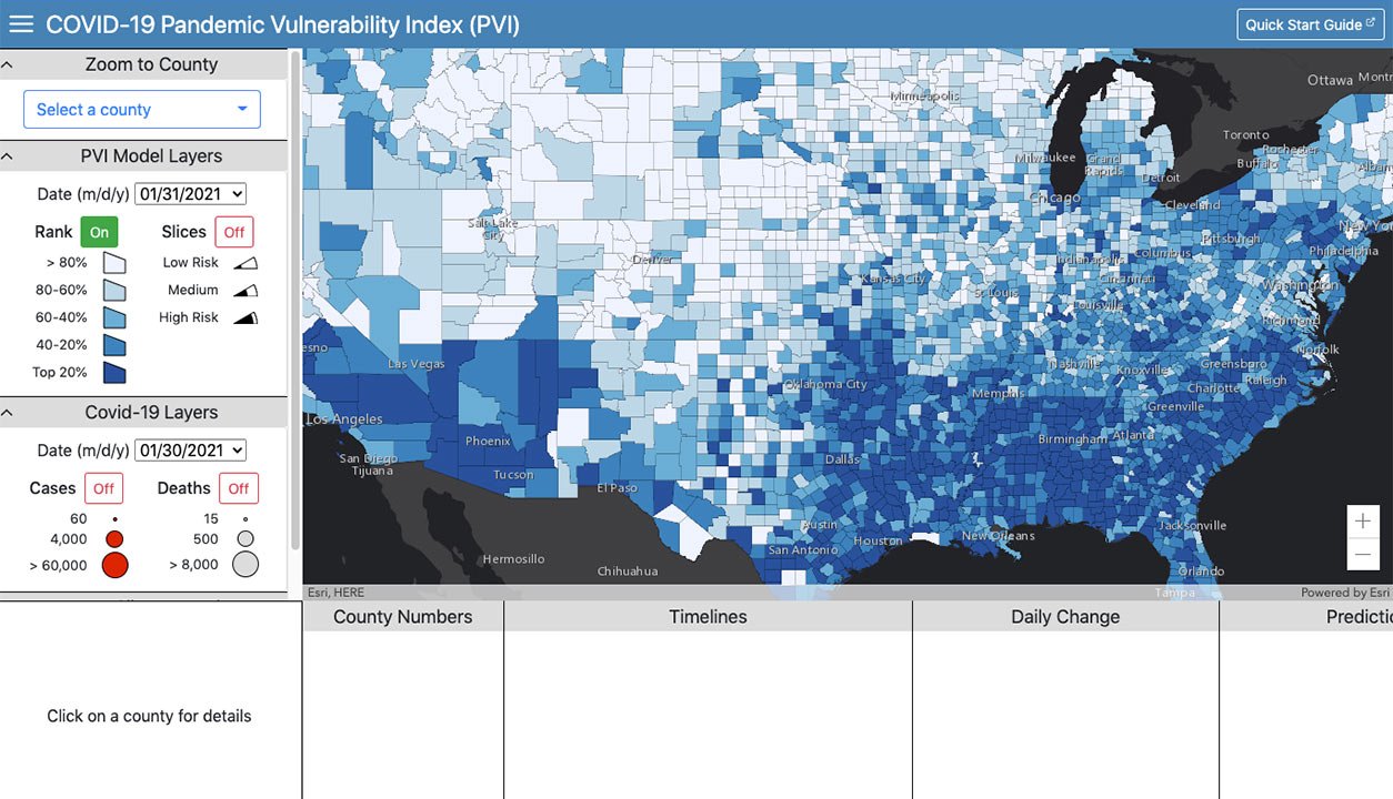 The Pandemic Vulnerability Index (PVI) dashboard, developed by scientists at NIEHS, North Carolina State University, and Texas A&M University, has now been added to the COVID Data Tracker resources curated on the U.S. Centers for Disease Control and Prevention website. Public health authorities, state authorities, and others can view real-time analysis of county-by-county data as they allocate resources and update responses to the ongoing coronavirus pandemic.