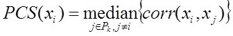 is computed as the median of the correlations among the ith profile (xi) to all other profiles (xj) assigned to pattern k (Pk). Until no more profiles are reassigned, the