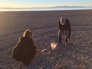 Researchers Shohreh Farzan, Ph.D. (left) and Lisa Valencia (right) collect dust samples from the dry lake bed of the Salton Sea.