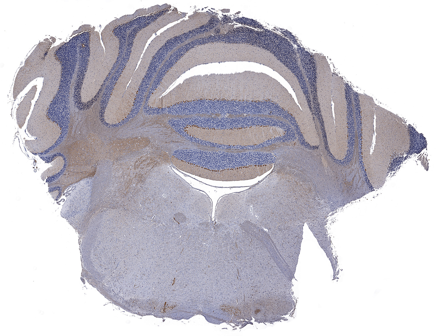 Calbindin D: Immunoperoxidase staining of formalin-fixed, paraffin-embedded mouse brain showing cytoplasmic staining of the Purkinje cells, as well as a granulated pattern throughout the processes.