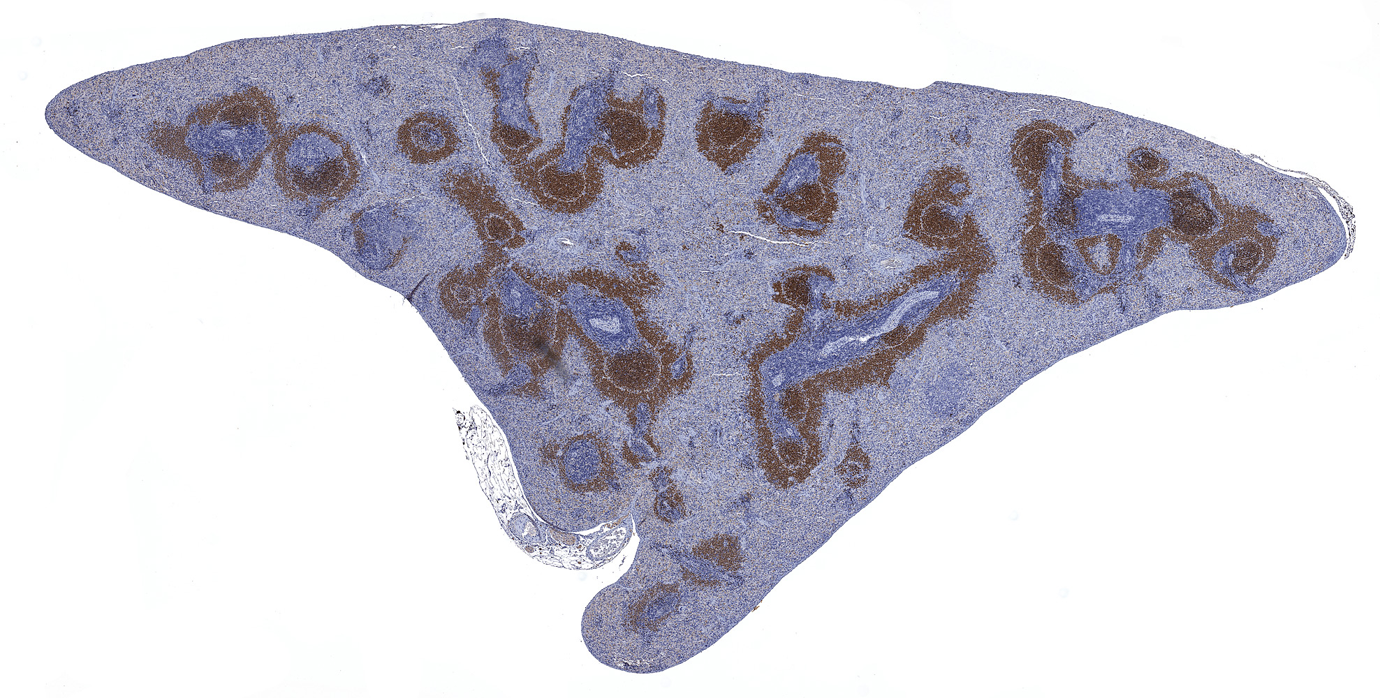 Pax-5: Immunoperoxidase staining of formalin-fixed, paraffin-embedded mouse spleen showing nuclear staining in B-cells.